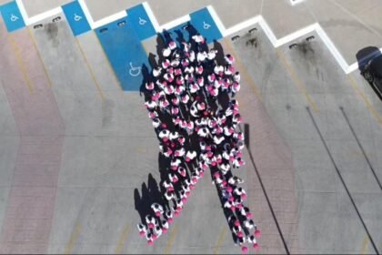 Voluntarias y voluntarios recrean el moño gigante color rosa. La Cruz Roja…