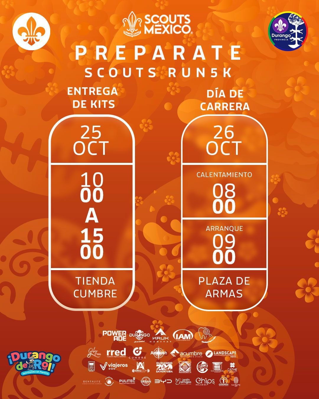 La Asociación de Scouts de México, Provincia Durango, agradece a todos los patrocinadores y colaboradores que hacen posible este evento. Los esperamos el 26 de octubre para correr juntos y fortalecer los lazos de nuestra comunidad a través del deporte, la convivencia y la hermandad scout.