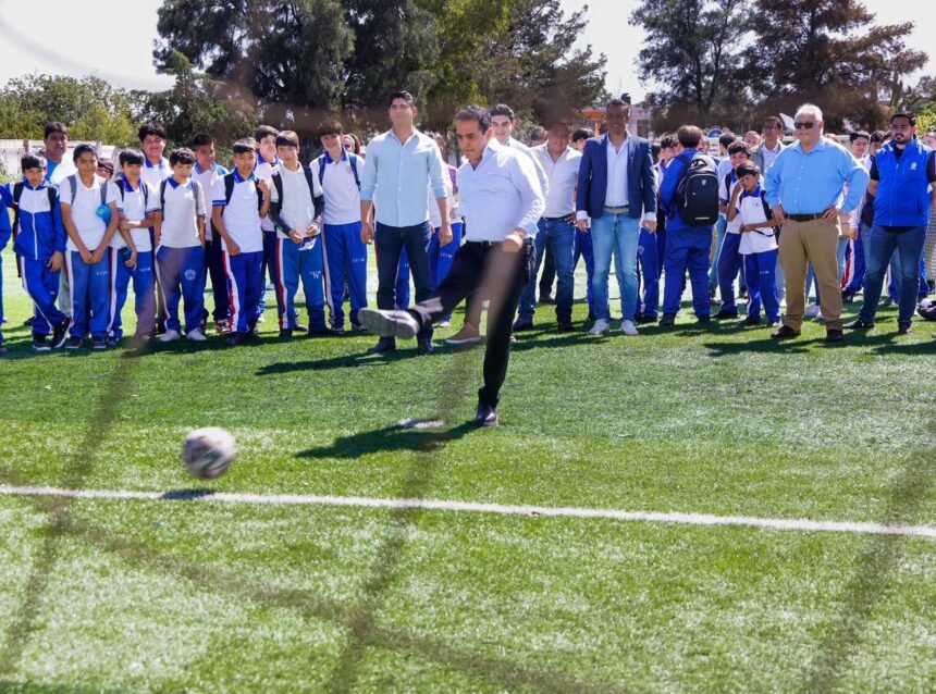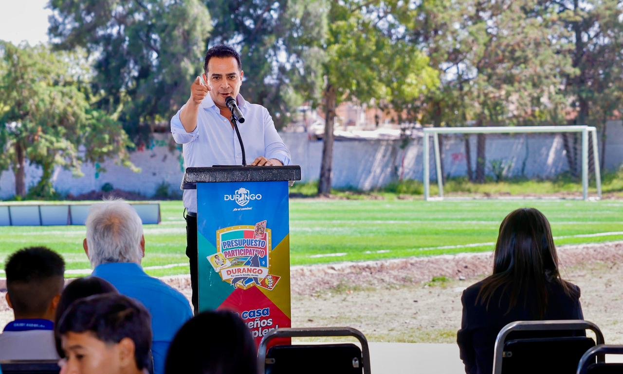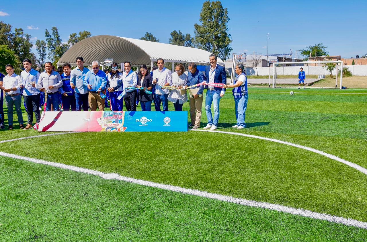 El Presidente Municipal de Durango, Toño Ochoa, entregó una nueva cancha de fútbol 7 en la Secundaria Técnica 62, un espacio digno para que las y los estudiantes practiquen deporte y fortalezcan la convivencia. La cancha cuenta con pasto sintético y porterías, y es el resultado del Presupuesto Participativo (PP), un programa que busca escuchar la voz ciudadana y cumplir sus sueños.