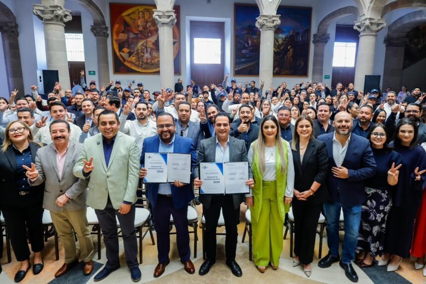 El alcalde de Durango, Toño Ochoa, firmó el Contrato Colectivo de Trabajo 2026-2028 con el Sindicato Único de Trabajadores Municipales (SUTM), cumpliendo con su palabra de mejorar las condiciones laborales de los trabajadores municipales. El acuerdo beneficia a cerca de 1,900 empleados con un aumento salarial del 6%, además de mejoras en prestaciones y condiciones laborales.
