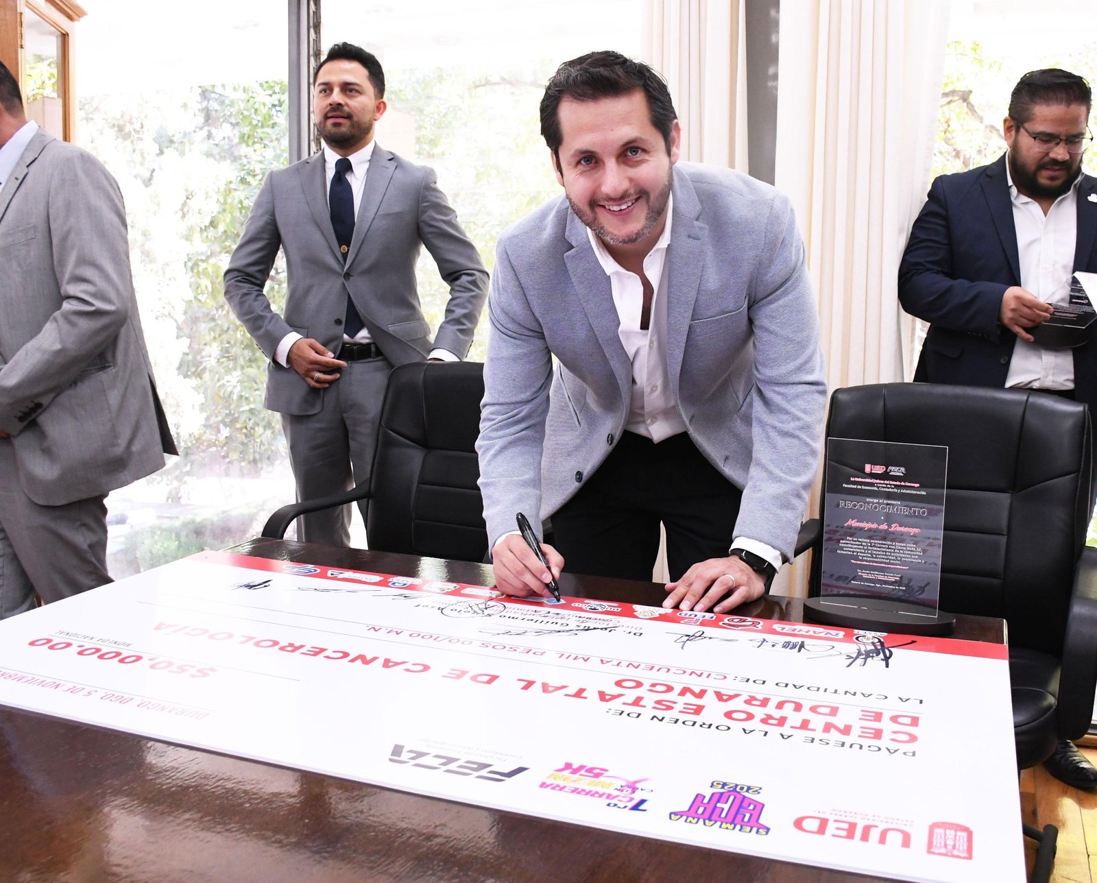 La Facultad de Economía, Contaduría y Administración (FECA) de la Universidad Juárez del Estado de Durango (UJED) entregó reconocimientos a patrocinadores y un donativo al Centro Estatal de Cancerología (CECAN) como resultado de la 1ª Carrera con Causa Neón 5K. El evento contó con la participación de autoridades universitarias, representantes del Patronato del CECAN y empresas patrocinadoras que se sumaron a esta causa.
