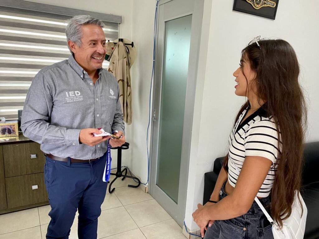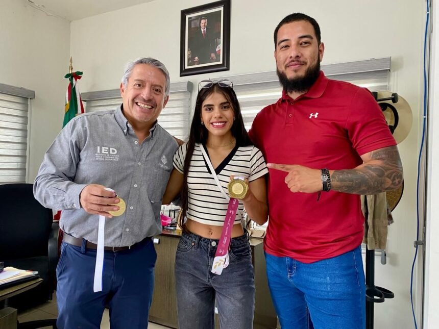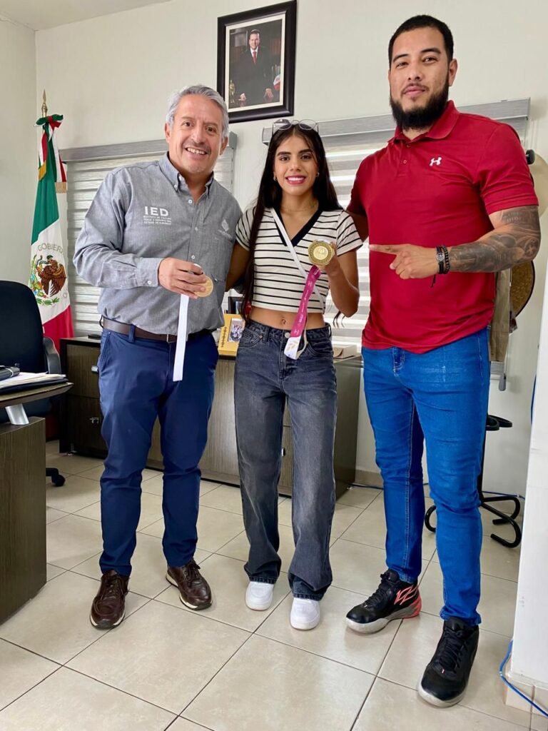 La campeona mundial de boxeo amateur, Valeria Sarahí Amparán Pizarro, y su entrenador Eduardo “Lalo” Bueno, visitaron al director del Instituto Estatal del Deporte (IED), César Omar Cárdenas Reyes, para mostrarle la medalla obtenida en la pasada Olimpiada Nacional, celebrada en Puebla, y compartirle detalles sobre su próxima participación en el Torneo Internacional BOXAM 2025, a celebrarse del 6 al 12 de octubre en La Nucía, Alicante, España.